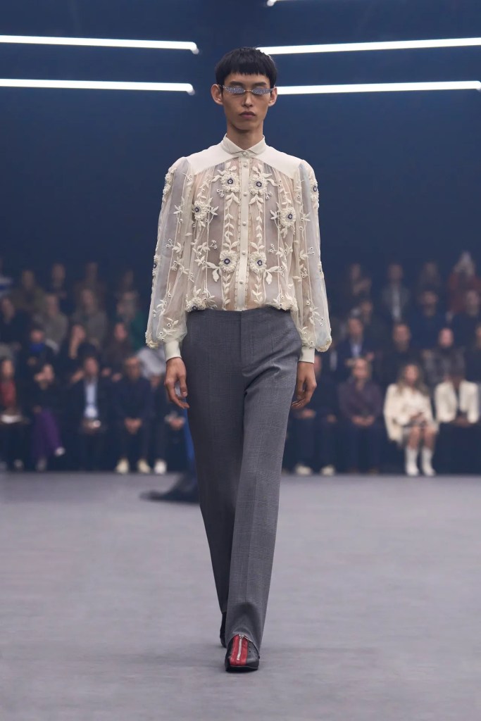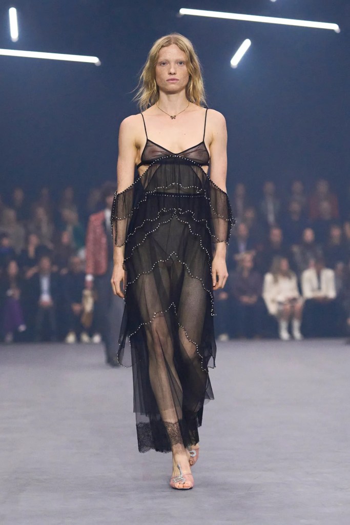 Sul piano estetico, Fireflies traduce la poetica dello stilista in una proposta dal linguaggio stratificato e profondamente coerente. Le silhouette si muovono tra opposti complementari: il rigore sartoriale dei tailleur dal taglio maschile, i blazer con spalle marcate, si alternano alla leggerezza di abiti impalpabili in chiffon e organza, dove il movimento diventa parte integrante della forma.